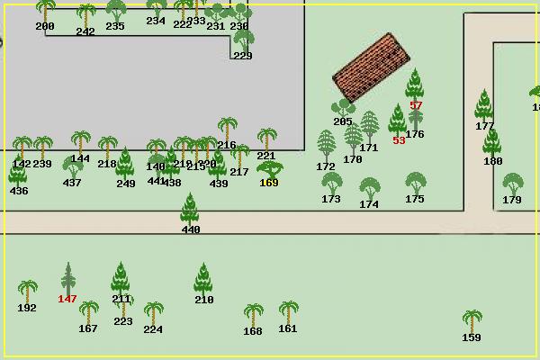 #53 Canary Island Pine Pinus canariensis #57 Canary Island Pine Pinus canariensis #140 Windmill Palm Trachycarpus fortunei #142 Windmill Palm Trachycarpus fortunei #144 Windmill Palm Trachycarpus fortunei #147 Monterey Cypress Cupressus macrocarpa #159 Canary Island Date Palm Phoenix canariensis #161 Guadalupe Palm Brahea edulis #167 California Fan Palm Washingtonia filifera #168 Mexican Fan Palm Washingtonia robusta #169 Canyon Live Oak Quercus chrysolepis #170 Black Locust Robinia pseudoacacia #171 Black Locust Robinia pseudoacacia #172 Black Locust Robinia pseudoacacia #173 Bay Laurel Umbellularia californica #174 Pittosporum Pittosporum sp? #175 Bay Laurel Umbellularia californica #176 Italian Cypress Cupressus sempervirens #177 Cedar Deodara Cedrus deodara #179 California Pepper Tree Schinus molle #180 Monterey Pine Pinus radiata #192 Windmill Palm Trachycarpus fortunei #200 Windmill Palm Trachycarpus fortunei #205 Lemon Tree Citrus limon #210 Monterey Pine Pinus radiata #211 Monterey Pine Pinus radiata