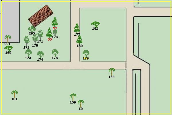 | #173 Bay Laurel Umbellularia californica #174 Pittosporum Pittosporum sp? #175 Bay Laurel Umbellularia californica #176 Italian Cypress Cupressus sempervirens #177 Cedar Deodara Cedrus deodara #179 California Pepper Tree Schinus molle #180 Monterey Pine Pinus radiata #181 California Live Oak Quercus agrifolia #205 Lemon Tree Citrus limon #221 Windmill Palm Trachycarpus fortunei