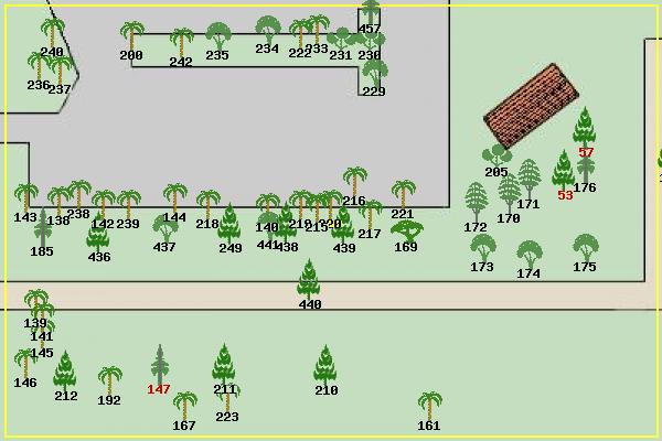 #53 Canary Island Pine Pinus canariensis #57 Canary Island Pine Pinus canariensis #138 Windmill Palm Trachycarpus fortunei #139 Windmill Palm Trachycarpus fortunei #140 Windmill Palm Trachycarpus fortunei #141 Windmill Palm Trachycarpus fortunei #142 Windmill Palm Trachycarpus fortunei #143 Windmill Palm Trachycarpus fortunei #144 Windmill Palm Trachycarpus fortunei #145 Windmill Palm Trachycarpus fortunei #146 Windmill Palm Trachycarpus fortunei #147 Monterey Cypress Cupressus macrocarpa #161 Guadalupe Palm Brahea edulis #167 California Fan Palm Washingtonia filifera #169 Canyon Live Oak Quercus chrysolepis #170 Black Locust Robinia pseudoacacia #171 Black Locust Robinia pseudoacacia #172 Black Locust Robinia pseudoacacia #173 Bay Laurel Umbellularia californica #174 Pittosporum Pittosporum sp? #175 Bay Laurel Umbellularia californica #176 Italian Cypress Cupressus sempervirens #185 Incense Cedar Calocedrus decurrens #192 Windmill Palm Trachycarpus fortunei #200 Windmill Palm Trachycarpus fortunei #205 Lemon Tree Citrus limon #210 Monterey Pine Pinus radiata #211 Monterey Pine Pinus radiata #212 Monterey Pine Pinus radiata