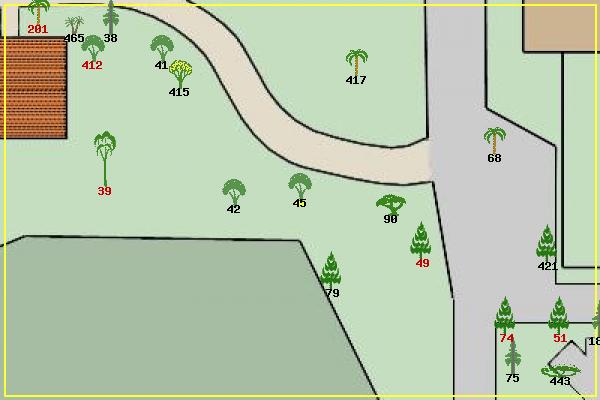 #38 Italian Cypress Cupressus sempervirens #39 Dwarf Blue Gum Eucalyptus globulus 'compacta #41 Japanese Maple Acer palmatum #42 Saucer Magnolia Magnolia soulangeana #45 Mayten Maytenus boaria #49 Canary Island Pine Pinus canariensis #51 Canary Island Pine Pinus canariensis #68 Canary Island Date Palm Phoenix canariensis #74 Canary Island Pine Pinus canariensis #75 Incense Cedar Calocedrus decurrens