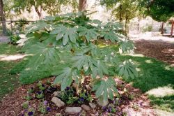 Comments: Evergreen broadleaf native to Japan. Low growing tree/bush with large deeply lobed glossy green leaves. Mature plant to 8'. Likes sheltered shady location. White flowers and black berries in summer and fall.