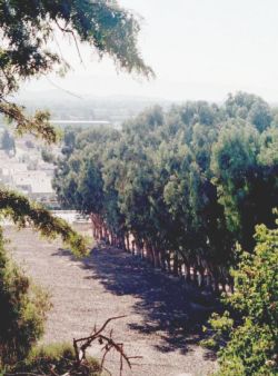 Comments: Broadleaf evergreen, native to Australia. First ones were planted in California in 1856. Probably is the fastest growing tree in the world. Dark green sickle-shaped leaves. White flowers in spring. Fibrous peeling bark. Two rows of Eucalyptus line the road leading to the Masonic Home.