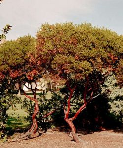 Comments: Evergreen broadleaf native to California and found throughout the state except for the inland desert areas. Waxy green 2" ovate leaves, small white flowers, dark purple berries and bright red to purple smooth bark. A large bush to small tree; broad spreading with 20' maximum height. A very drought tolerant plant which will die back if watered. The wildfires in the canyons of Southern California often involve manzanita and other chaparral plants.