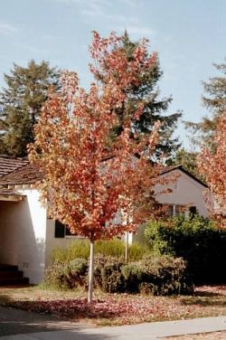Comments: Deciduous broadleaf native to eastern North America (southeastern Canada to the southern US states). Three to five lobed 4" wide serrated green leaf with a lighter green to white underside and a red petiole. Bark is light gray. Adult tree to 60' tall with equal spread. Turns red early in the fall.