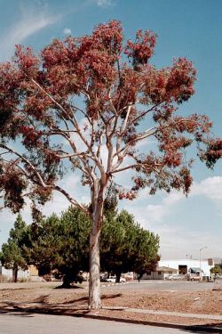 Comments: Evergreen broadleaf native to Victoria, South Australia and New South Wales, Australia. Smooth barked eucalyptus with lanceolate leaves and showy red flowers in groups of three. Flower color is not a prime identifier for this plant. Tentatively identified as Eucalyptus leucoxylon subsp. megalocarpa. The specimen tree was removed.