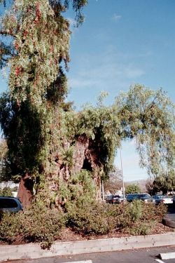 Comments: Evergreen, native of South America. Brought to California by Spanish padres. In early summer flowers appear followed by red berries in great quantities, leading to the colloquial name "Pepper-tree". This tree has a chamber in the trunk large enough to stand in.