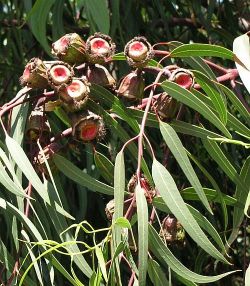 Comments: Broadleaf evergreen mallee (multi-stemmed shrub) native to Western Australia. Leaves are gray-green concolorous (top and bottom the same color), opposite (or nearly so) and lanceolate, the bark is tan to gray, smooth and sheds in flakes, the gumnuts are in 3's, axillary, and on a 25mm long flattened peduncle. The gumnuts are exceptionally large--25mm wide by 30mm long, somewhat bell shaped and have a red disk of an unusual shape (looks a bit like an enlarged red blood cell). the Calyptra scar is uneven and appears to have 4 dried out regions that look a bit like teeth. Calyptra (flower cap) is scarlet red, and flower is bright yellow. This species was identified by Dan Sekella.