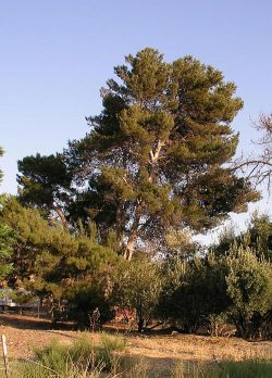 Comments: Evergreen conifer native to groves in Monterey, San Mateo, Santa Cruz and San Luis Obispo Counties in California. Three 4" to 5" long green needles per sheath, on red to brown stems. Bark on trunk is brown but graying with age. Tree conical to cylindrical with flattened top in older trees. This species is widely planted throughout the world.