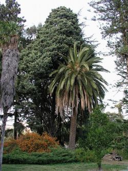Comments: Evergreen conifer native to Guadalupe Island west of Baja California in Mexico. Pale blue-green scales which are tight to the branchlet and a smooth purple red bark which curls off in small flakes. Foliage is similar in look to sequoia giganteum but bark is much different. This species is endangered in its natural habitat, and not widely grown elsewhere. This specimen might have been purchased as early as 1898 from the California Nursery Company.
