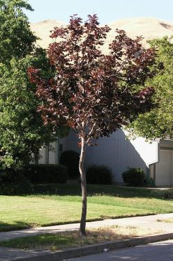 Comments: Broadleaf deciduous tree native to Northern Europe. This specimen has dark purple 5 lobed leaves with a somewhat lighter purple color on the underside. The species grows to 40 foot and is broad spreading. There are several examples of this species along Almeria Ave.