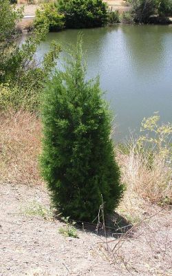 Comments: Evergreen conifer native to small groves in Santa Cruz and San Mateo Counties in California. This species has small scale-like dark green needles held tight to upward pointing branchlets, small globular cones, and red scaley bark. As with most cypresses, this species is conical in youth, but broadens as it ages. Mature height to 75 feet. This species is listed as endangered due to its restricted native habitat.