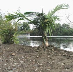 Comments: Feather frond palm from Madagascar Island off the east coast of Africa. This species is marginal in our area as it prefers warmer weather and plenty of water. The specimen is planted in an area adjacent to Snell Pond where there is plenty of water. The species is fast growing and can attain a height of 30 to 40 feet.