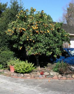 Comments: Evergreen broadleaf from Southeast Asia and India. Dark glossy green ovate leaves with small wing-like extensions to the stem, gray bark, creamy white flowers and orange colored fruit. Species brought to California in the 1770's by the Spanish Missionaries. Numerous trees throughout Washington Township and one of the nation's premier citrus growers is located in Mission San Jose, but the area is too far north for commercial orange growing. The orange is believed to be a cross between a pomelo (Citrus maxima) and a tangerine (C. reticulata).