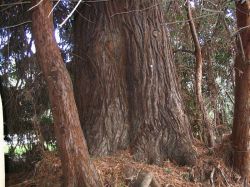 Comments: Evergreen, native to coast ranges from Oregon to California. This the California state tree. The redwood perpetuates itself by sprouting. After a fire a redwood tree often sends out sprouts around the base of its trunk, forming the redwood rings which are so common in the sequoia forests. This is the largest specimen in our area.