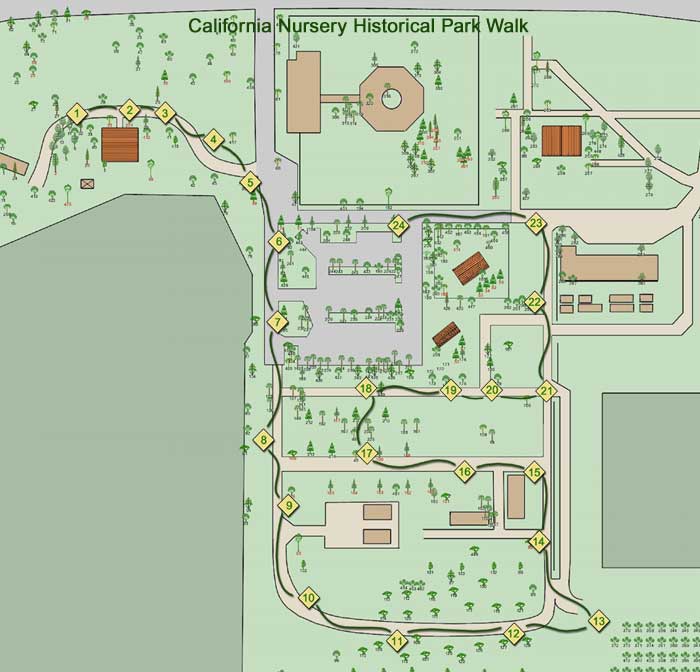 #2 California Nursery Company Office. The office was built in the 1900's and modified in the 1020's to give it a Spanish style. These offices were used to create catalogs, posters and other advertising as well as corespondence with California Nursery's domestic and international customers. The Pindo palms flanking the entrance were planted on Arbor Day in 2002 to replace similar trees known to have been planted there in the past.