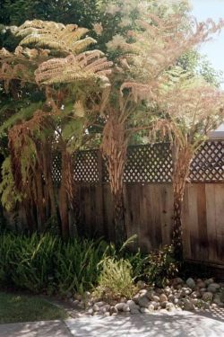 Comments: Fern trees are primative evergreen vascular plants that reproduce without seeds. There are a wide variety of fern species and the type pictured is unknown. It is suggested the species are Cyathea australis or Cyathea cooperi, with C. cooperi being the most likely.
