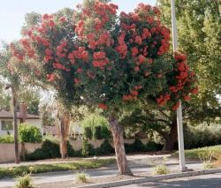 Comments: Broadleaf evergreen, native of western Australia. This tree produces the most attractive red flowers that bloom practically all year round. It is of moderate size and spreading habit. (former scientific name Eucalyptus ficifolia)