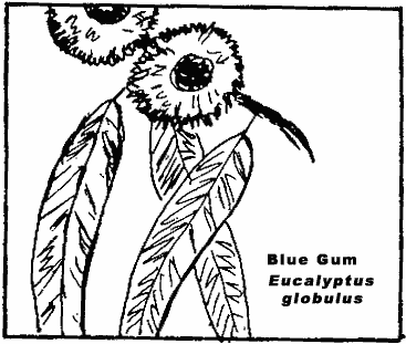 Comments: Broadleaf evergreen, native to Australia. First ones were planted in California in 1856. Probably is the fastest growing tree in the world. Dark green sickle-shaped leaves. White flowers in spring. Fibrous peeling bark.