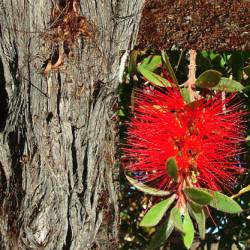 Comments: Evergreen tree native to coastal parts of Australia. Bright red spiked flowers that surround the branch and tight to the branch pea sized woody seed pods are indicative of this plant. Mature height to 15' in native environment. Leaves are 2" to 3" long and terminate in a point. Close relative to the paper bark melelucas.