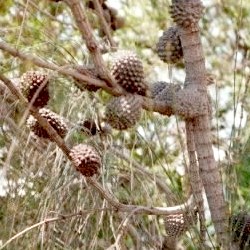 Comments: Broadleaf evergreen, native mostly to Australia. Long, thin, jointed, green branches with inconspicuous leaves looking like pine needles. Matrue trees to 80' in native habitat. Produces woody, conelike fruits. Tree is very drought tolerant.