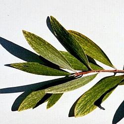 Comments: Evergreen broadleaf tree native to coastal New South Wales and Queensland, Australia. Dark green, 2" to 3" long leaves, white bottlebrush type flowers, and pea-shaped woody seed pods. Persistant white Paper-like bark is a distinguishing feature of this tree species. Mature trees to 50' tall in native habitat, shorter locally. Trees do well in swampy soil, and have become a pest tree in Florida Everglades.