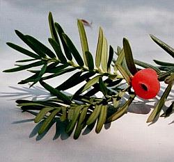 Comments: Evergreen gymnosperm, closely related to the conifers, native to Europe, Asia and N. America, but mainly Europe and Asia. Dark green 1" sharp needles spiraled about branch. Sparse bright red fruit with black seed exposed in center. Specimen tree 15' but mature trees to 100' with the oldest tree believed to be over 2,000 years old.