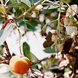 Comments: Broadleafed evergreen native to California and the Pacific Coastal Ranges. Leaves are approx. 2" long and dark green; bark is red and peels away exposing a smooth green undercoat which turns red with age. Height is usually under 10' but tree can grow to 50'. Red fleshy fruit in Summer. Not really a "roadside" tree, but the tree is easily accessable by foot and the path is paved.