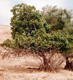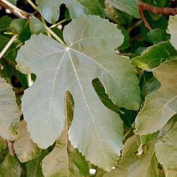 Comments: Deciduous broadleaf native to Iraq but rapidly spreading to the Mediterranean area. Large deeply lobed dark green leaves, and fleshy fruit. Mature trees to 60' but more commonly bushy and low growing. Figs were one of the first fruits cultivated, and the first brought to the Missions of California. George C. Roeding played an important part in the development of California's Calimyrna fig industry.