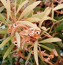 Comments: Broadleaf evergreen, native of Australia. The wood is harvested in Australia for cabinet and decorative work. Flowers are creamy-white in ball-like clusters in March-April, red colored seed pods in late summer and fall.