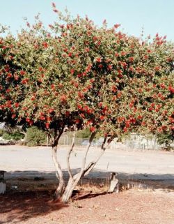 Comments: Evergreen tree native to coastal parts of Australia. Bright red spiked flowers that surround the branch and tight to the branch pea sized woody seed pods are indicative of this plant. Mature height to 15' in native environment. Leaves are 2" to 3" long and terminate in a point. Close relative to the paper bark melelucas.