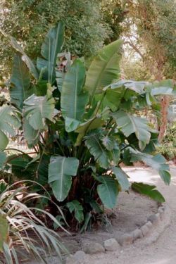 Comments: Evergreen broadleaf native to subtropical South Africa. Palm like when mature, this plant has large green leaves which look like feather fronds without the regular leaf divisions. A large white flower with a blue beak-like horizontal projection gives this plant its name. The plant is not frost tolerant and will die back in cold winters.