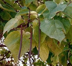 Comments: Deciduous broadleaf native to Mississippi and Ohio River Valleys. Large sweetheart shaped yellow-green leaves. White bell shaped flowers in early summer and long string-bean shaped seed pods in late summer and fall. Specimen tree is 30' tall but trees in native environment can be 75' or more.