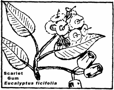 Comments: Broadleaf evergreen, native of western Australia. This tree produces the most attractive red flowers that bloom practically all year round. It is of moderate size and spreading habit. (former scientific name Eucalyptus ficifolia), City of Fremont Landmark Tree.