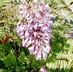 Comments: Deciduous tree native to the dry highlands of Brazil. Mature trees can be 40' to 60' tall and broad spreading. Blue-violet flowers in Summer and bright green double-pinate compound leaves are similar to a mimosa tree. Seed pods are disk shaped to 3" diameter. Young trees are frost sensitive, but mature trees can take temperatures down to -7 deg. F.