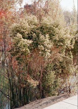 Comments: Evergreen broadleaf native to the local area and much of California. A bush to small tree with small dark green leaves and creamy white flowers in winter (wet season). It is part of California's chaparral plant community. The plant is drought tolerant, and deer-proof.