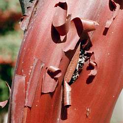 Comments: Evergreen broadleaf native to California and found throughout the state except for the inland desert areas. Waxy green 2" ovate leaves, small white flowers, dark purple berries and bright red to purple smooth bark. A large bush to small tree; broad spreading with 20' maximum height. A very drought tolerant plant which will die back if watered. The wildfires in the canyons of Southern California often involve manzanita and other chaparral plants.