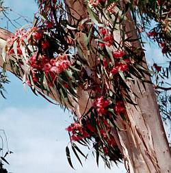 Comments: Evergreen broadleaf native to Victoria, South Australia and New South Wales, Australia. Smooth barked eucalyptus with lanceolate leaves and showy red flowers in groups of three. Flower color is not a prime identifier for this plant. Tentatively identified as Eucalyptus leucoxylon subsp. megalocarpa. The specimen tree was removed.