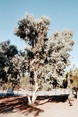 Comments: Evergreen broadleaf native to Queensland and New South Wales, Australia. Persistant gray-brown bark on trunk and branches, Ovate to elliptic leaf, small white to cream colored flowers in clusters. Tree Tentatively identified as Eucalyptus populnea.