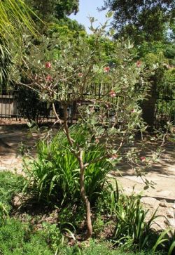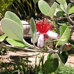 Comments: Broadleaf evergreen flowering plant native to Argentina, Brazil and Uruguay in South America. This tree has 2" gray-green eliptic leaves, large mauve colored flowers with red stamens, and small pear shaped fruit. Some varieties of this plant are low growing while others can be 15' tall and just as broad.
