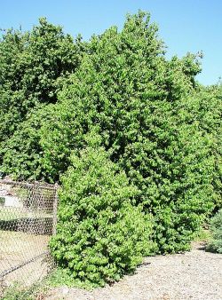 Comments: Evergreen broadleaf native to southern Asia and Europe. This plant has shiny dark-green oval leaves with short holly-like spikes, dark purple inedible fruit with a large seed, and gray bark on the trunk and major branches. The tree is often used as a hedge or screen as the foliage is low growing and very dense. Mature trees to 40' or more. Leaves, stems, fruit, seeds, and bark are poisonous.
