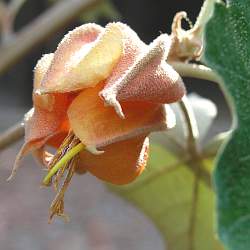 Comments: Broadleaf evergreen tree which is a cross between Fremontia and the Monkey Hand tree. Large broad ovate leaves with three apices, orange to yellow bell shaped flowers, and gray bark. The hybrid species forms into a small multibranched tree to 20' tall.