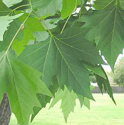 Comments: Broadleaf deciduous hybrid cross of an American Sycamore and Asian Maple. This species was developed for urban environments where resistance to polution is important. The London Plane has large (8" to 10" wide), deeply lobed, California Sycamore-like green leaves with prominent radiating veins, mottled bark, and 2 seed balls on the same pedicle. Though very similar in appearance to the California Sycamore, the London Plane leaves are larger, and lack the white felt-like hairs on the underside. Additionally, the London Plane lacks aruricles on the leave petioles (these are leafy extensions where the leaf attaches to the twig. Two varieties of London Plane planted locally are "Bloodgood" and "Yarwood." Nelson Kirk and Dan Rivera have contributed information for this description.