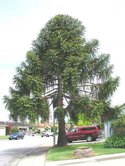 Comments: Conifer, native to Australia. Planted in coastal and valley areas of California. A dense, wide-spreading, pyramidal tree with horizontal branches that dip gradually downward and turn up at the tips. Gone before November, 2020