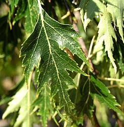 Comments: Broadleaf deciduous tree native to northern Europe. Light green deeply incised ovate leaves with serrated edges, light gray to white bark on trunk and large branches. New branches are pendulous. Specimen is 30 to 40 foot tall.