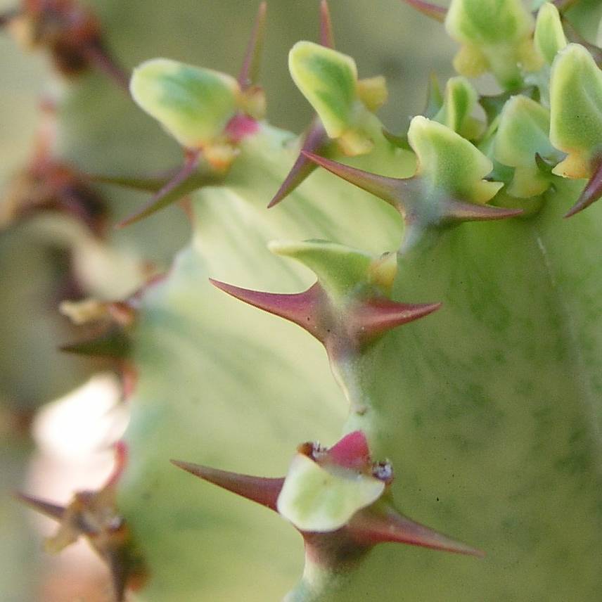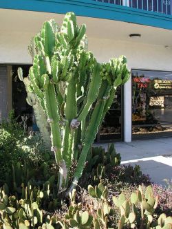 Comments: An vertically growing cacti native to South Africa and eastern Africa to the equator. No leaves to speak of, but the species continues to branch vertically to heights up to 60 feet. Distinctive spines grow along the outer edges of the branches. Sap from this plant is poisonous and caustic! Keep the sap off your skin and out of your eyes! This species is drought tolerant but cold sensitive. Adrian from Hayward identified this tree and said it was the largest seen north of Santa Barbara--unfortunately it was recently pruned and no longer has that distinction.