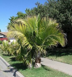 Comments: Feather frond palm from Madagascar Island off the east coast of Africa. This species is marginal in our area as it prefers warmer weather and plenty of water. The specimen is planted between sidewalk and curb, and shows typical yellowing due to poor soils and lack of water. The species is fast growing and can attain a height of 30 to 40 feet.