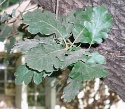 Comments: Broadleaf deciduous tree native to east central Canada and the Midwest of the US. Bur Oak is in the white oak family with blunt lobes. This species has rather large acorns with heavily furred boots. Trees to 40 or 50 feet in our area, larger in its native range.