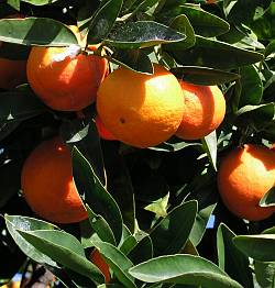 Comments: Evergreen broadleaf from Southeast Asia and India. Dark glossy green ovate leaves with small wing-like extensions to the stem, gray bark, creamy white flowers and orange colored fruit. Species brought to California in the 1770's by the Spanish Missionaries. Numerous trees throughout Washington Township and one of the nation's premier citrus growers is located in Mission San Jose, but the area is too far north for commercial orange growing. The orange is believed to be a cross between a pomelo (Citrus maxima) and a tangerine (C. reticulata).