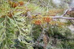 Comments: Evergreen, native to Queensland, Australia. It is a narrow tree, growing to many picturesque shapes, with dark green feathery foliage and slender sprays of showy orange flowers which bloom in summer.