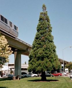 Comments: Evergreen conifer native to California. Trees are a grey-green with short cedar like needles and thick red bark. Locally, these trees can be 100' tall with a 25' spread. Giant Sequoias are the largest trees in the world and are some of the oldest at over 3,300 years. Specimen is located along the BART tracks.